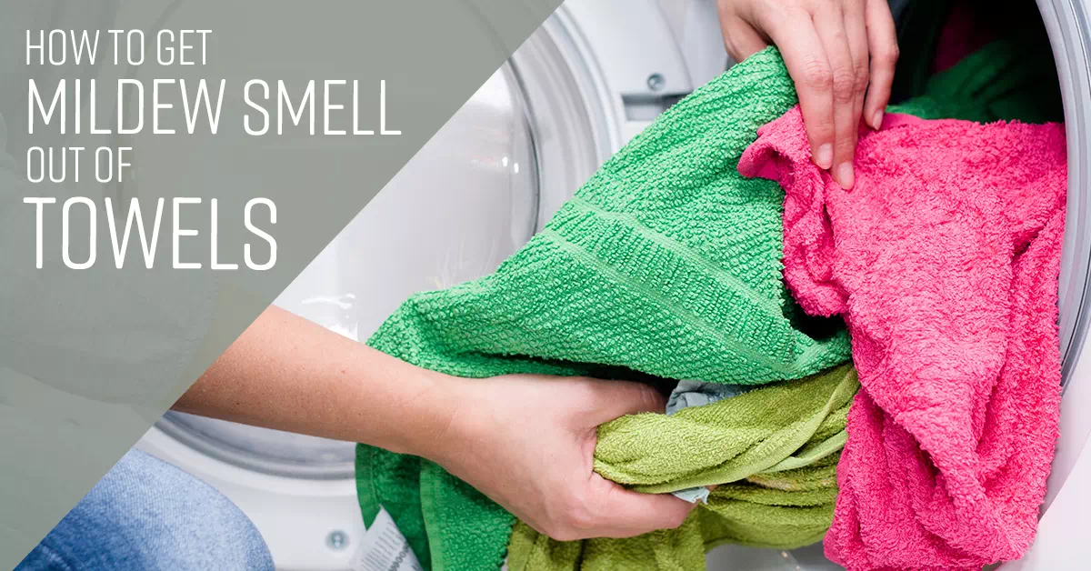 I had noticed a mildew smell in our laundry room, and finally found the stinky towel wedged put your towel in your dryer with a dryer sheet or dryer balls, and they should come out smelling fresh and new!